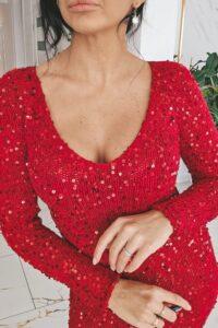 Luminosa to dopasowana, elegancka sukienka o ponadczasowej sylwetce, zaprojektowana z myślą o wyjątkowych okazjach. Dzianina łączy w sobie miękkość i elastyczność merino z delikatnym połyskiem nici bawełnianej ozdobionej cekinami, które tworzą efekt świetlistej tafli poruszającej się wraz z ciałem.