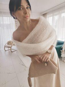 Model charakteryzuje się prostą, uporządkowaną konstrukcją oraz klasyczną formą, która pięknie układa się na ramionach i sprawdza się zarówno w stylizacjach codziennych, jak i eleganckich. Etola może pełnić funkcję lekkiej narzutki, szala lub ozdobnego dodatku do sukienek i minimalistycznych zestawów.