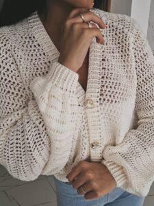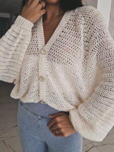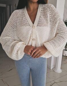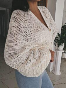 Wzór na szydełko. Model o obniżonej linii reglanu. Sweterek robiony od góry.