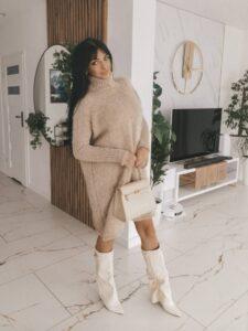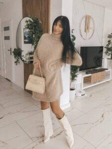 CLAIRE to otulająca swetro-sukienka o charakterze „soft luxury”, zaprojektowana z myślą o minimalistycznej elegancji i zimowym komforcie. Jej siłą jest połączenie dwóch rodzajów przędzy oraz przemyślana konstrukcja, która łączy lekkość z wyraźną, dopracowaną formą.