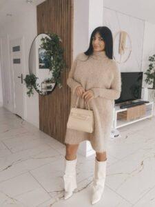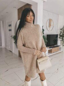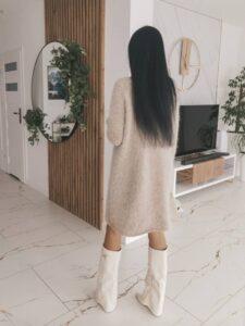 Sukienka ma formę luźnego, miękko opadającego oversize, który otula sylwetkę, ale jej nie przytłacza. Dzięki miękkiej strukturze alpaki model wygląda wyjątkowo lekko i „powłóczyście”.